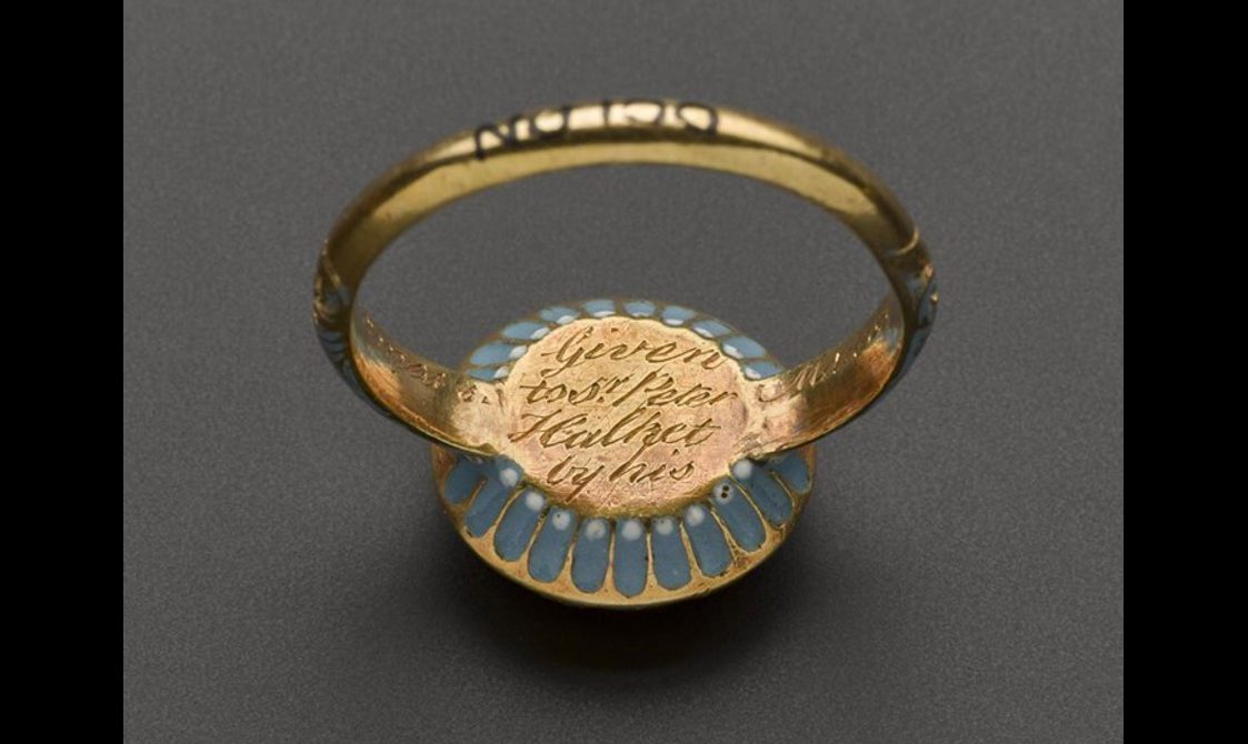 The back of the ring given by James VII to Sir Peter Halket, showing the inscription. Museum reference H.NJ 100.