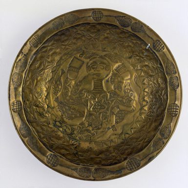 Tray of beaten and decorated brass work, Nigeria, pre-1894.