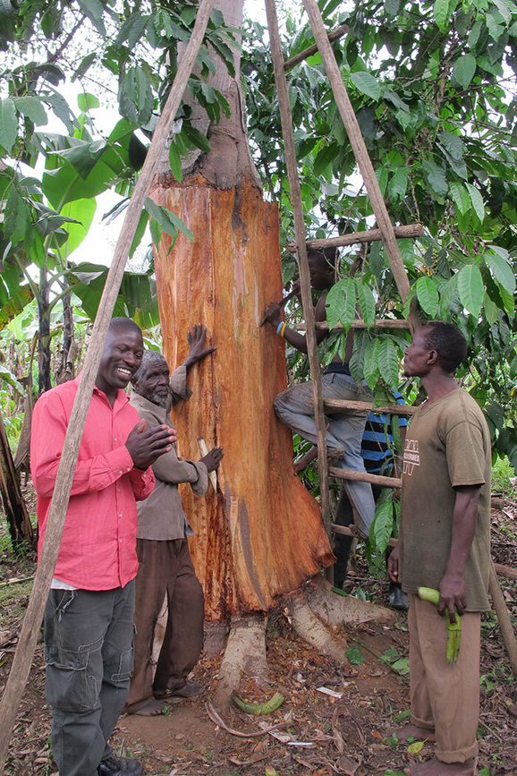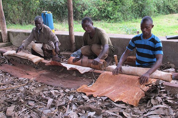 Barkcloth is a cloth produced by stripping lengths of bark from the mature mutuba tree, Ficus natalensis, which grow easily in the fertile central southern region of Uganda, where it has been produced for centuries. After the removal of the bark the tree trunk is wrapped for protection, typically in banana leaves, which grow nearby, allowing another bark to grow, to be harvested again and again on an annual basis for up to 30 years.