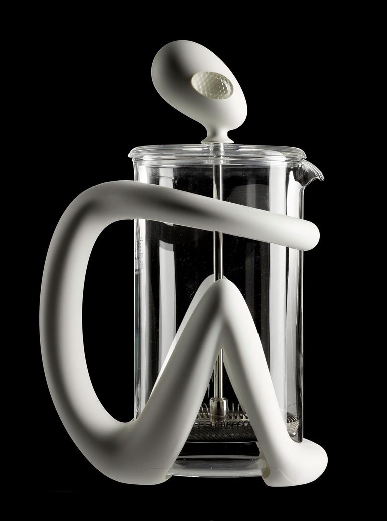 Inka cafetiere in white, featuring an alien figure holding the glass jug, by Guido Venturini, manufactured by Alessi, Italian, Piedmont, Crusinallo, 2000 (K.2002.359).