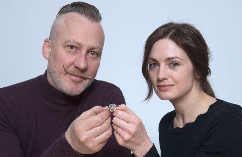 Signet ring of Scottish gold with its maker, award-winning jeweller Chay McClory of Hamilton & Inches, and Curator Sarah Laurenson.