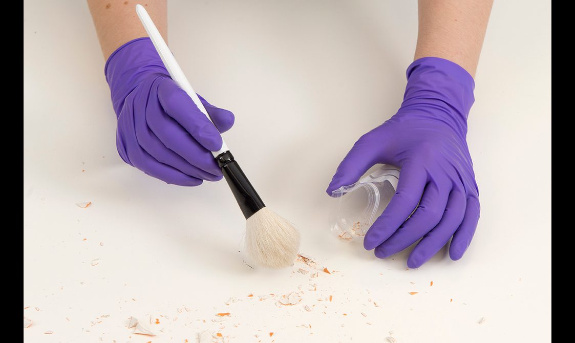 Wear nitrile gloves to prevent finger marks and sweat deposition. These materials are easily chipped so they should be packed or protected when you are moving them, placed on a padded surface for storage or consultation.