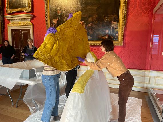 Once the mantua had arrived at Kensington Palace, it then had to be carefully unpacked and installed on the specially designed mannequin for display. This wasn't a task for one person, it requires careful handling and it took three conservators from the team at Historic Royal Palaces to do this!