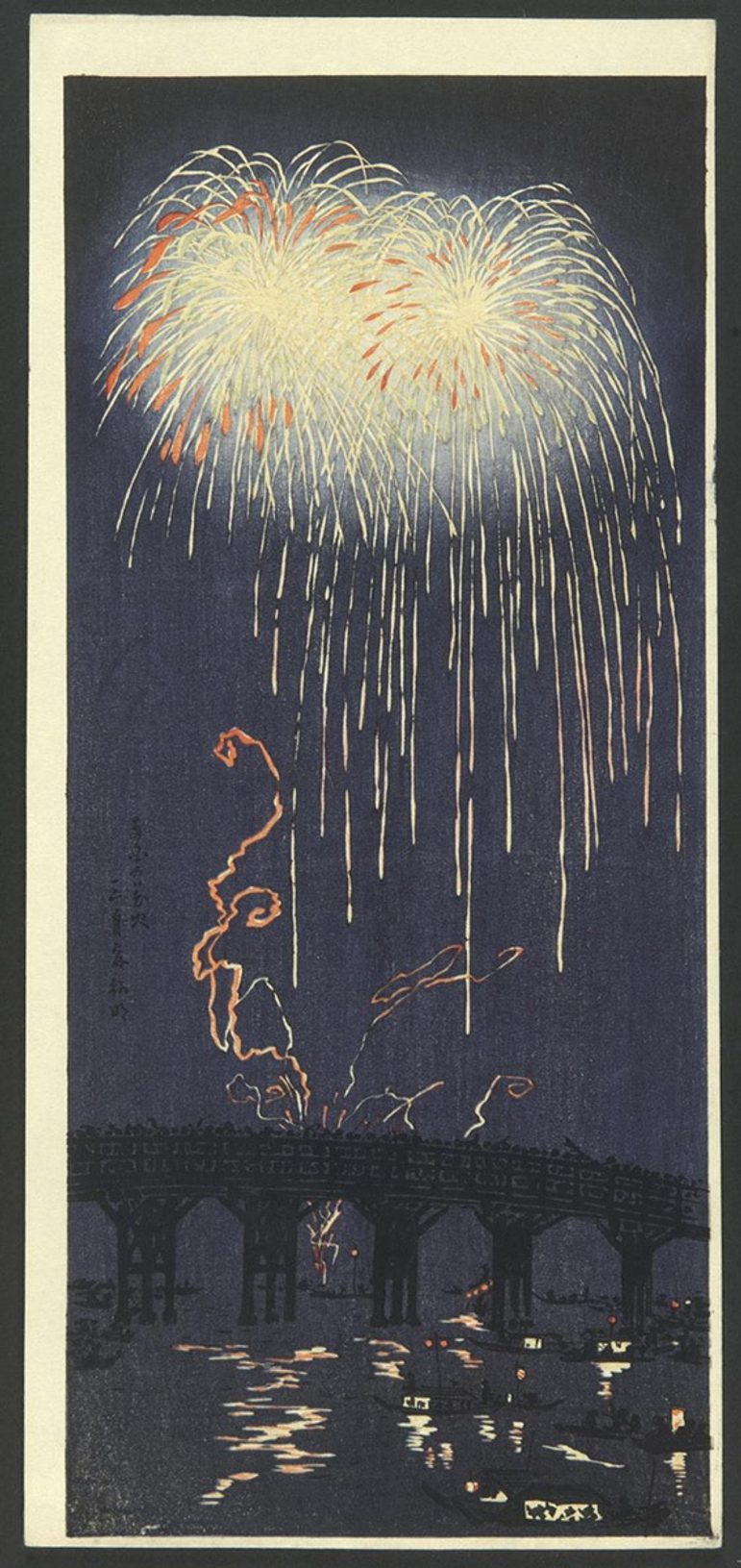 Colour woodblock print showing fireworks above Ryogoku Bridge in Tokyo by Takahashi Hiroaki c. 1921-36. Museum reference: A.1990.105